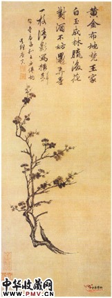 此画画折枝梅花,其花用浓淡水墨点成,颇有质感。自题:"黄金布地梵王家,白玉成林腊后花。对酒不妨还弄墨,一枝清影写横斜。公堂看梅和王少傅韵,吴趋唐寅。"唐寅的这幅折枝梅花固然有孤芳自赏自命清高的一面,但整个画面清新的意趣,却给人一种秀雅的美感。唐寅的这幅墨梅,主干虬曲劲挺,用笔潇洒劲健;枝干或斜刺而出,或扶摇而上,苍劲挺秀。梅花疏而有致,错落组织自然,用浓淡的水墨点出,质感传神。