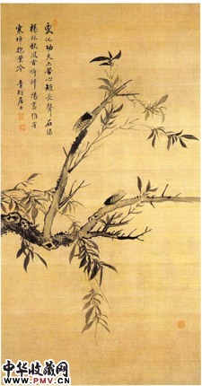 画面为自左向右延伸之柳树,上有双蝉,用笔细致,风格写实,体现的是一种野趣,自题之诗则加了一层力度,诗云:"变化工夫亦苦心,短长声在绿杨林。秋风古岸斜阳里,惟有寒蝉抱叶吟。"墨中带赭是不常见的风格,也是蒋画的一个重要特点。其用笔简逸,类似写意,但细细观之,尽得柳、蝉之神韵。