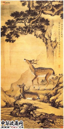 柏树下、溪流畔的风景,两只梅花鹿一立一卧,神态悠然,动态生动,极是传神。最为引人注意的是鹿的描绘,十分工整、细腻,山石的点染、溪波的勾勒也有类似笔调,十分细致而并非完全照抄写实,显得画面既真实又不泥于细节。柏、鹿均是中国传统的吉祥物,从题款可知,是作者为友人祝寿而作。此轴可视为作者翎毛走兽的代表作品之一,极为清丽活泼。