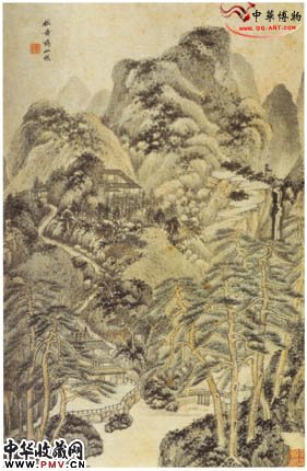 此册共12开,6开设色,6开墨笔,分别为临倪云林、梅道人、黄子久、陈惟允,董北苑、巨然、赵千里、王蒙、董其昌等。此图仿黄鹤山樵,浅绛设色,构图繁密,山石多用披麻、牛毛皴,颇有王蒙神韵,然苔点更多地显示出自己的个性。笔墨技巧极为熟练,而且富有灵气。