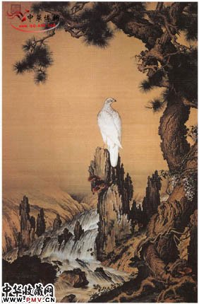 《嵩献英芝图》是郎世宁来华以后的早期作品。在这件作品中郎世宁充分显示了他扎实的素描基本功,以及利用明暗来表现凹凸立体效果的本领。画面的右侧是一棵弯曲盘绕的老松,苍老班驳的树干和前后掩映的松针;松树的根部和石之间,有灵芝数株,其边沿卷起,表现了灵芝的厚度;画面的左边是坡石,一条急湍的溪流顺势而下,在山石隙谷间曲折绕行,激起无数水花。此图的绘画技法以欧洲的为主。但题材内容却纯粹是中国传统的东西。