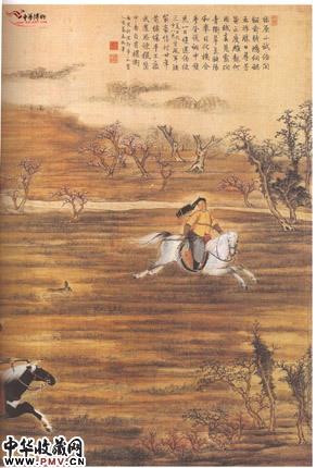图中郎世宁表现了骁勇善战的射猎人物形象,很是写实。郎世宁所创造的此类风格的中国画可以说只有他一人为代表,最终也未能蔚然成风,究其原因,可能就在于它过分写实,不是中国画之风。而后世西学东渐时,这样的枝叶改进也不足为训了。