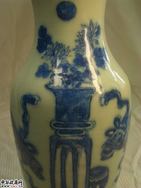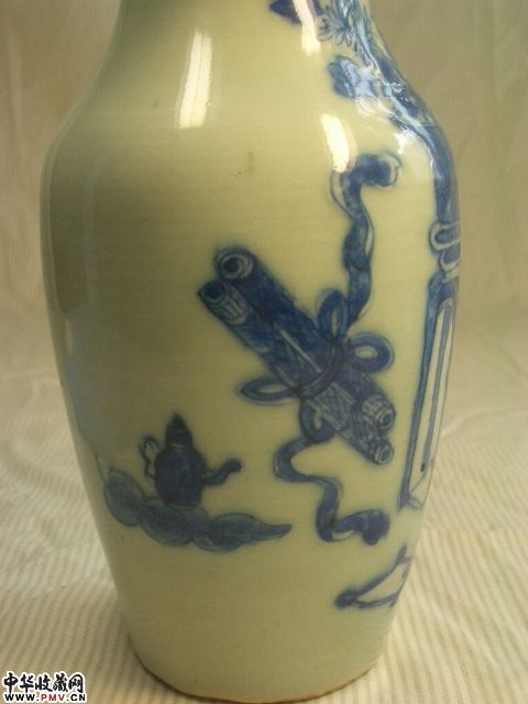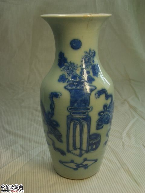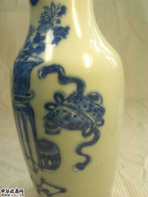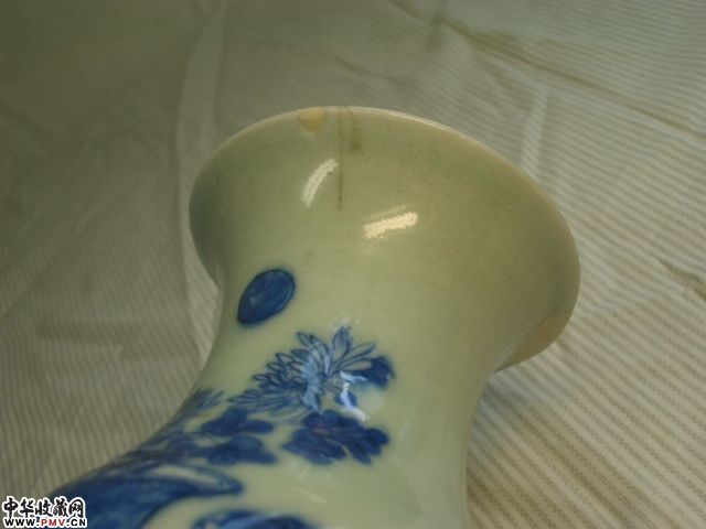 品相:器行周正,胎釉莹润,青花发色靓,瓶背颈有一小点缩釉,口沿有一冲及修补(见图),其余完好,可玩。