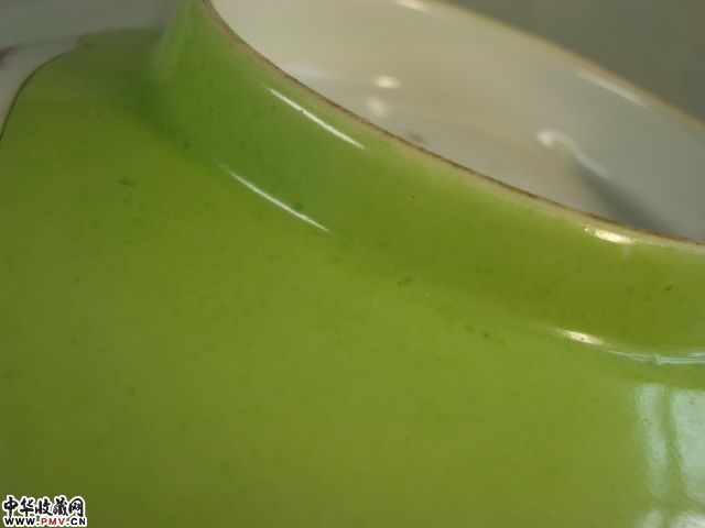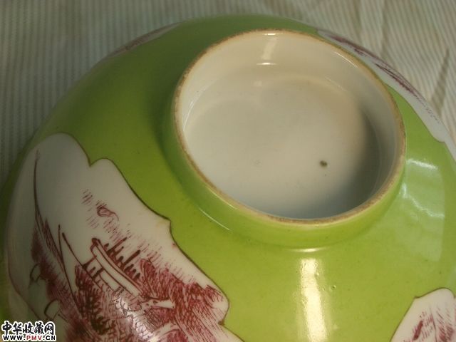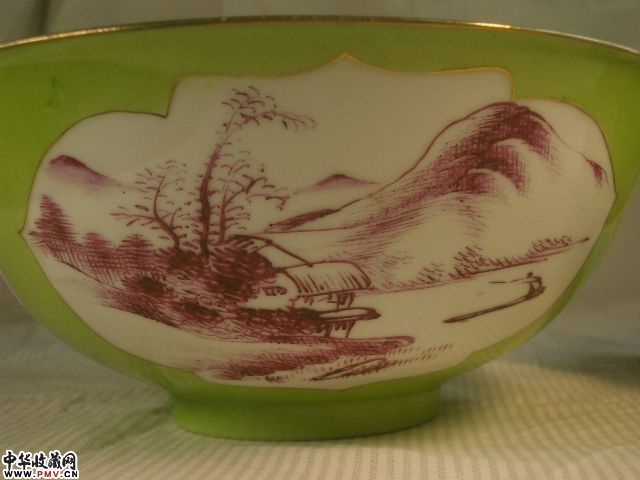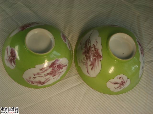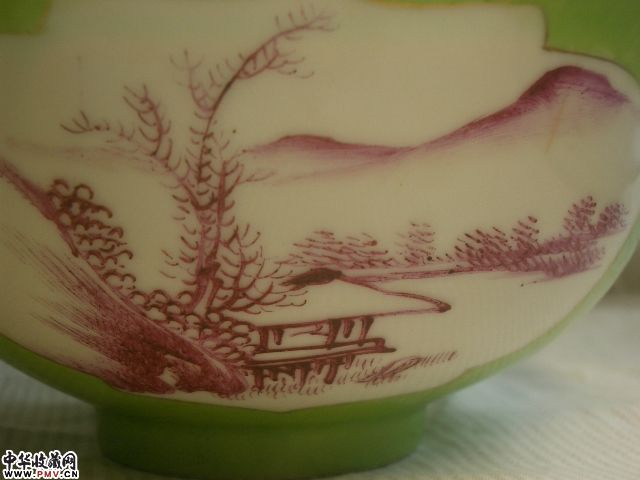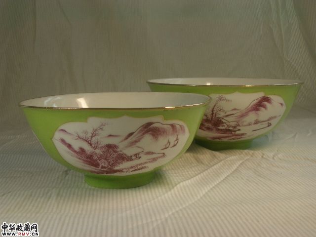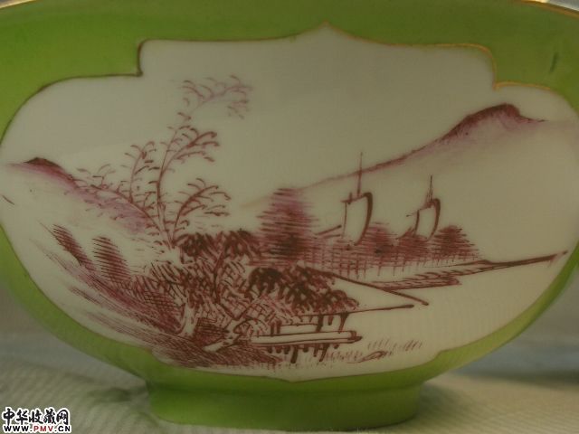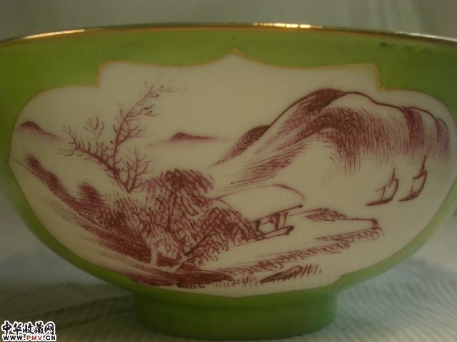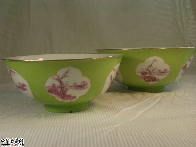 品相:承清宣统年秋葵绿,四开光金红釉山水纹,口沿及开光描金,一只保存完美(除一点小缩釉),另一只老冲一条约2.6cm,其余完好。