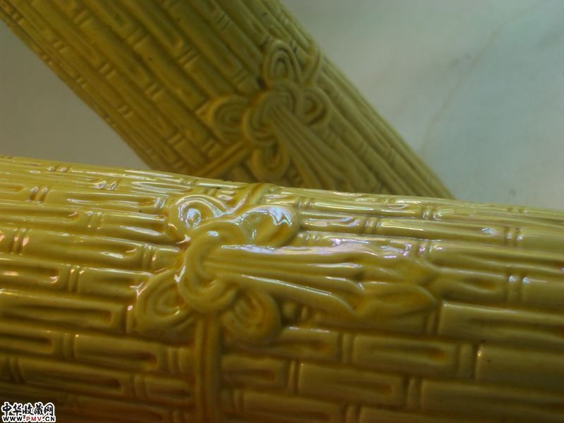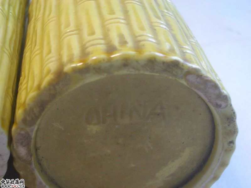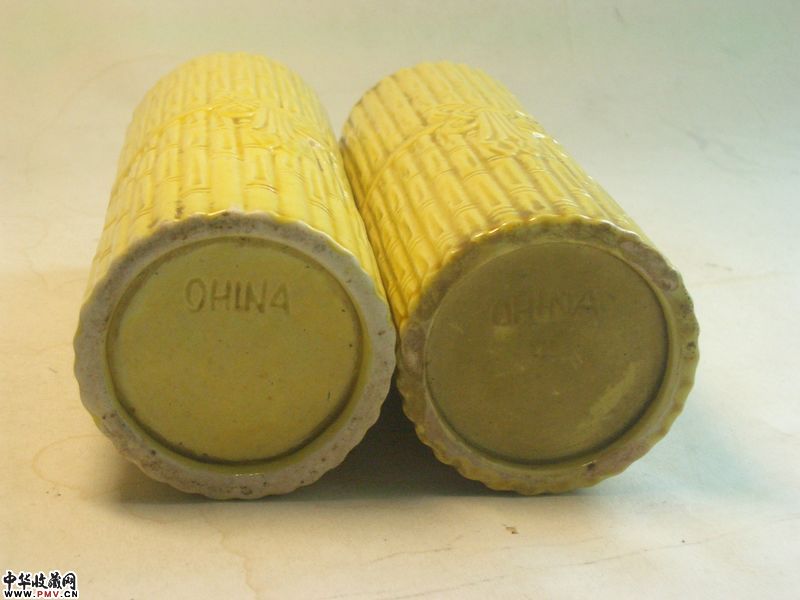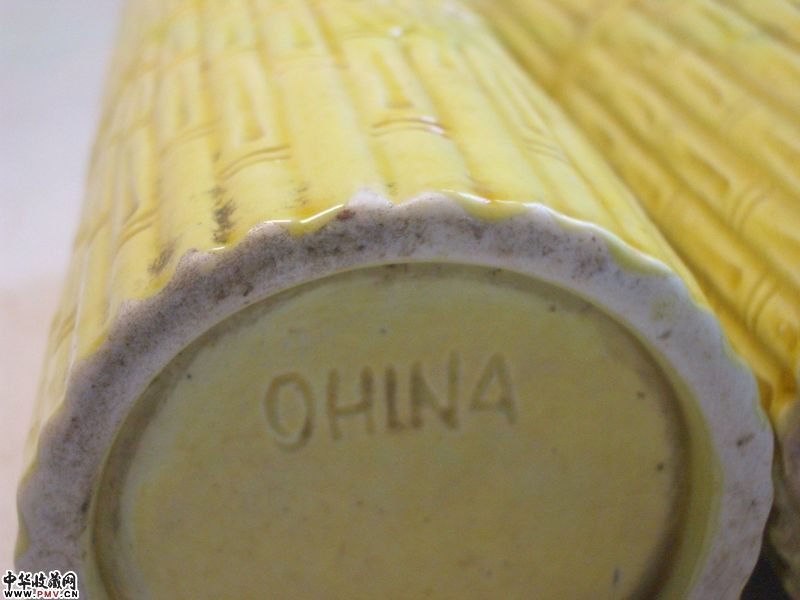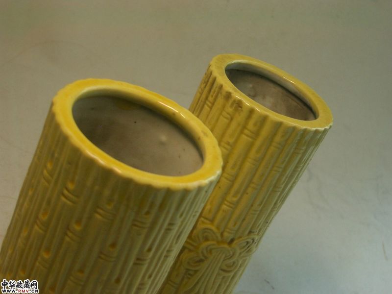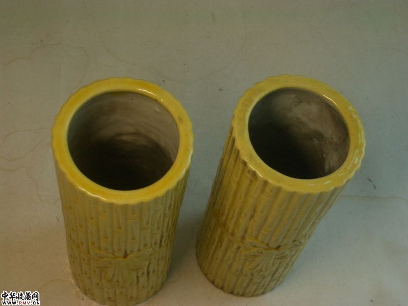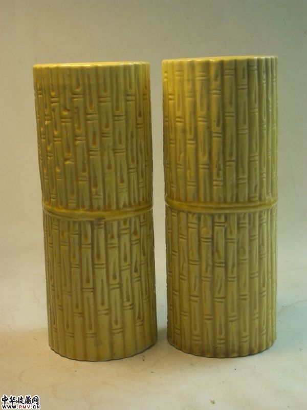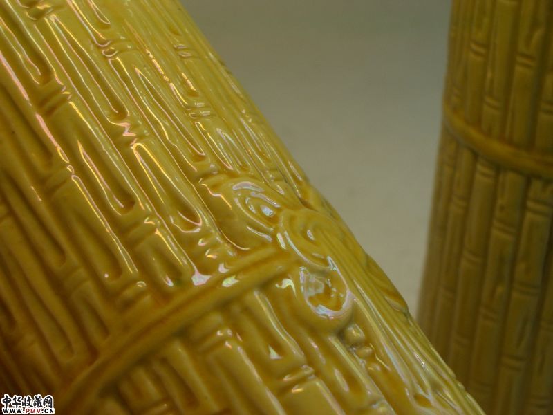 品相:像生竹形,黄釉均匀莹润,器形规整,保存完美,全品相。底有英文中国刻款。