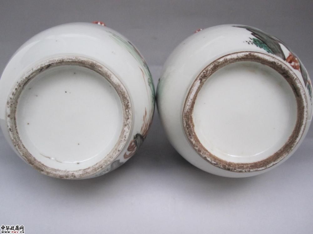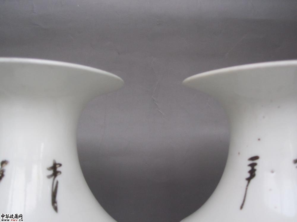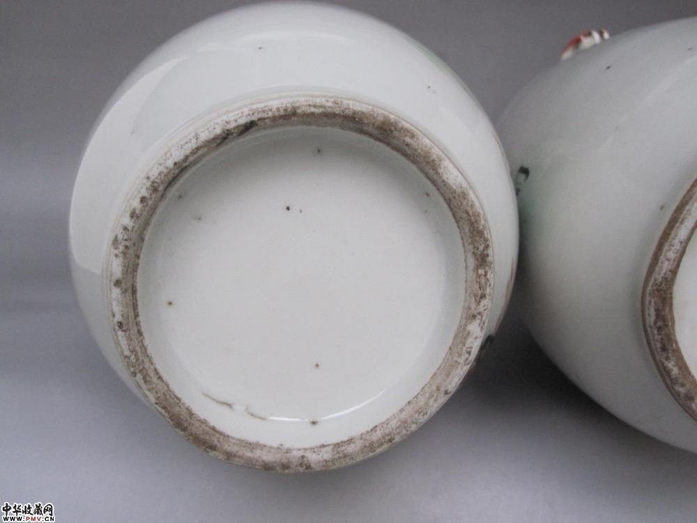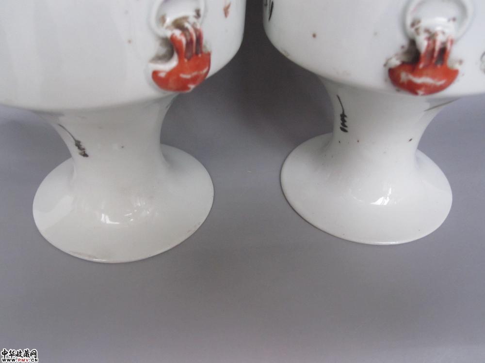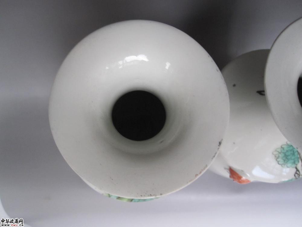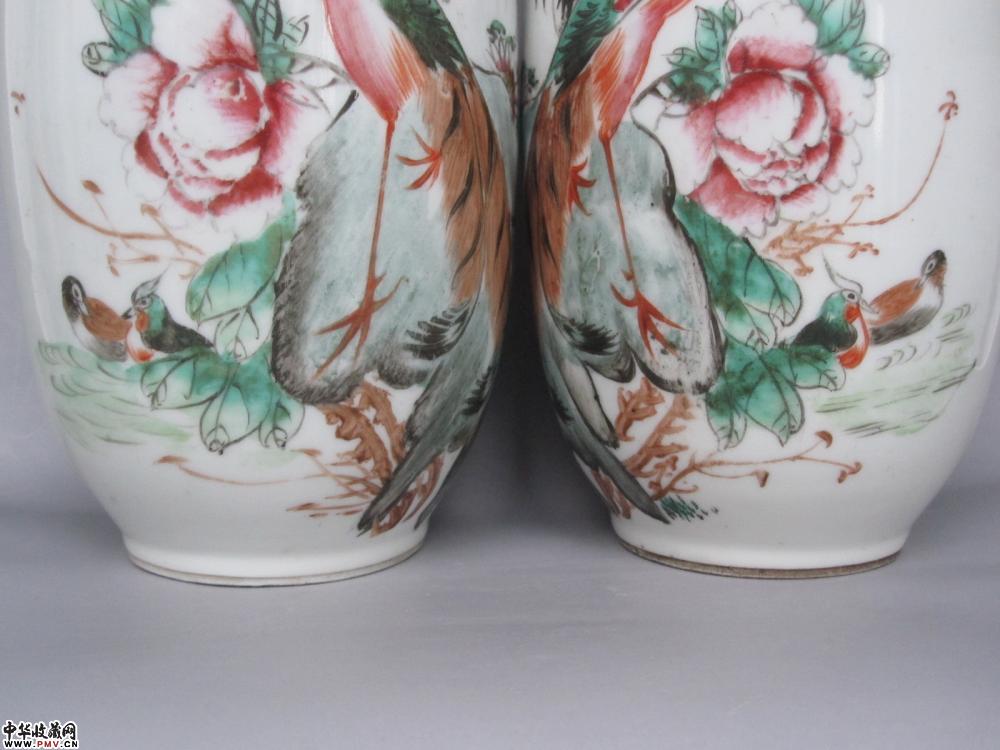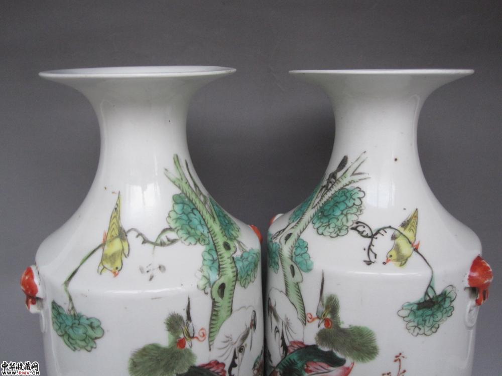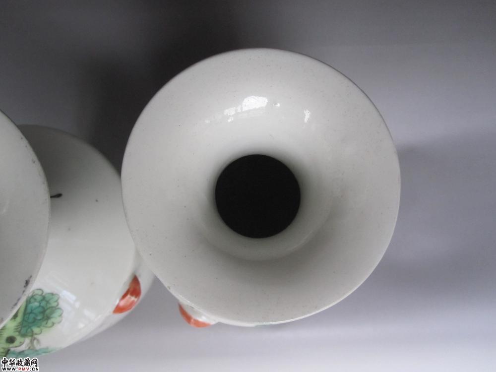 尺寸、高:25.7厘米,口径:8.9厘米,足径:7厘米。品相:两只瓶口精修,不仔细看不出。其余完好。原物比图片好看,瓷质洁白细腻,彩头好,画工非常精美,画意生动,名家作品,难得的收藏品。