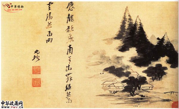 此图册共八开,此图表现的山村欲雨的景色。虽为米家山水,但笔墨技法受到董其昌的影响,以浓淡不同的墨点和墨色,渲染坡坨层林,留白处宛如浸漫于岭间的云霭。用简略的线条勾出村屋数幢。
