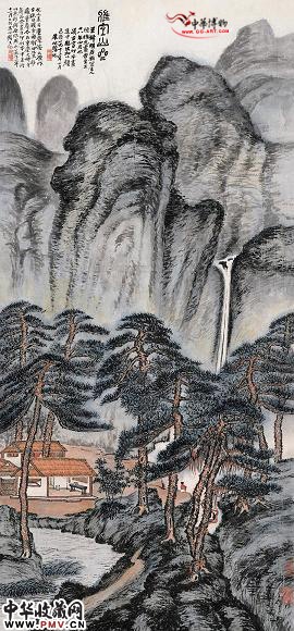 钤印:屺瞻(二次)、我年八十二、二瞻老民 题识 :雅宜山斋。王叔明为雅宜主人陈惟允画,时至正十八年四月也。清古宫印本画集中临出,加以颜色。时一九七三年十月。朱屺瞻记。友人来自重庆,据云原作在抗日战争时期由北京移藏重庆,今为重庆大佛寺藏品。余画自印刷本中来,所以色彩与原作钵也。一九七三年十一月上旬,朱屺瞻又记。