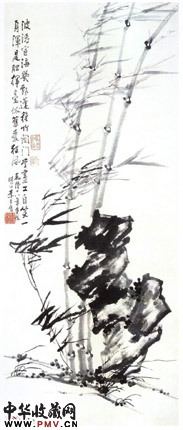 画中竹子数根,依于石旁,挺拔有力,有参天凌云之概。画家用夸张的手法,秃笔直扫,画竹叶扁方状成倾斜方向,有力地表现了疾风的狂吹,竹子虽然受着疾风的一时鼓荡,但无"风行草偃"的情态,笔笔枝叶呈现出坚贞不屈的力量。画上有画家自题:"波涛宦海几飘蓬,稚竹关门学画工,自笑一身浑是胆,挥毫依旧爱狂风。"