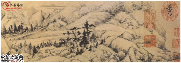 此画用墨笔画平远山景。山峦起伏层叠,林壑幽深,连绵无际。全幅布局严紧而气势雄健,苍苍莽莽,一气呵成,用笔苍劲老辣,墨气浑厚,兼有生拙秀润的特点。画中自题云:"关仝关山雪霁图在余家,一纪余未尝展观。今日案头偶有此小侧理,以图中诸景改为小卷,永日无俗子面目,遂成之。乙亥夏五,玄宰。"正如卷后顾大申跋谓"文敏墨妙,自成一家,适意匠心,不全摹古"者。