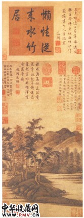 此图写一仙居景致,平静的水面环绕着一段坡石,几株大树簇生其上,枝叶扶苏。树后一岸边空地上,树间茅舍掩映,屋后竹林茂密,远处高大山坡下,林木葱郁,相比而生。整个画面弥散着幽静、清凉的气氛。画中笔墨沉实、赋形具体,为画家中年时期的代表作之一。