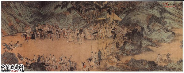 此图用笔工细,线条简练而精确,设色快而秀丽,形象真实生动,具有唐人风范。以高丽(朝鲜)国诞生之神话为画题。传说河伯之女生卵得子,名朱蒙,猿臂善射,随王出猎,箭无虚发,为王所嫉而俗杀之。朱蒙乘马遁去,水族助其渡河。