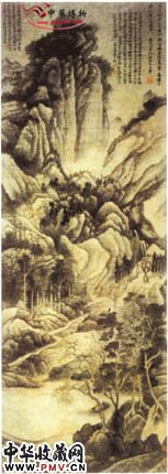 此图画层峦叠,杂木长松,构图繁而用笔简,华滋苍润,山石淡皴点,用大小披麻皴,树木兼取枯枝蟹瓜夹叶,各尽其妙。