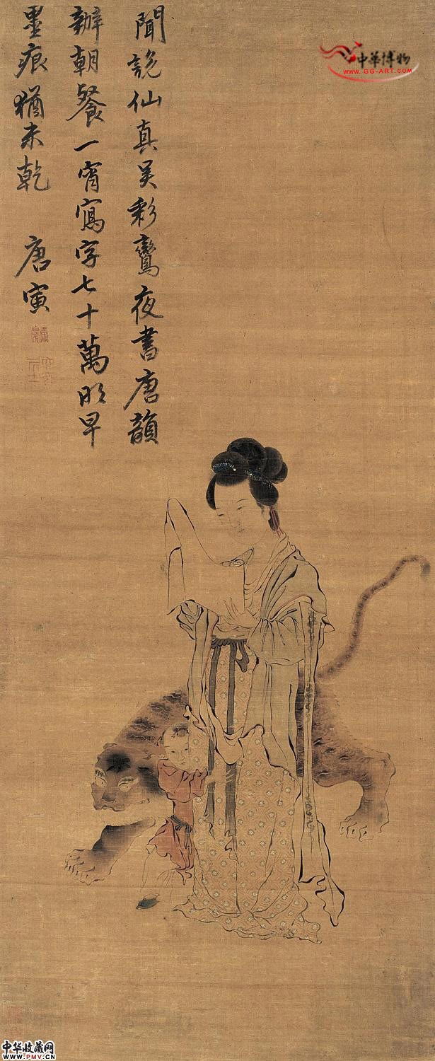 钤印:唐伯虎、六如居士题识:闻说仙真吴彩鸾,夜书唐韵伴朝餐。一宵写字七十万,明早墨痕犹未干。唐寅。 唐寅,自署晋昌唐寅,字伯虎,一字子畏,号六如居士,吴县(今江苏苏州)人。弘治十一年举应天解元。治圃舍于桃花坞。作画行笔极秀润缜密,而有韵度。人物、仕女、楼观、花鸟,无不臻妙。书法入赵孟俯堂庑。