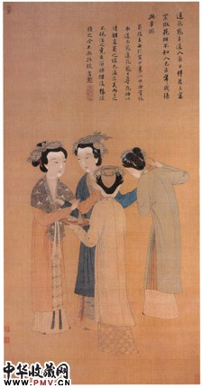 此画取材于五代西蜀后主孟昶的宫廷生活,精心描绘了四个盛装宫妓的神情状貌,并题诗云“莲花冠子道人在,日侍君王宴紫微,花柳不知人已去,年年斗绿与争绯。”画面中间有一正一背两个宫妓,在近处的背向者身穿一件淡黄色的长褂,与其相对者则身穿一件颜色较深的花青大褂,这就在颜色上产生了强烈的对比,产生了生动的艺术效果。其余的部分或浓或淡,或冷或暖,或呼应或对称,变化十分巧妙自然。值得注意的是,画家所描绘的仕女,皆柳眼樱唇,下巴尖俏,这就使我们得知当时的时尚。在设色上,画家采用了“三白”设色法,就是用白粉烘染额头、鼻子、脸颊,这一方法的运用对表现宫妓弱不禁风的情态起着十分明显的作用。