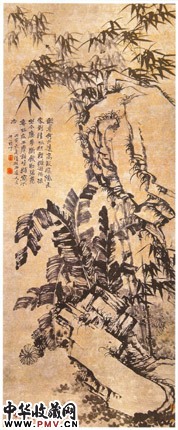 此图绘芭蕉、山石、翠竹和小草,画家用墨色的浓淡变化来表现梅竹的身姿神韵。画竹以流畅的笔调伸出竹竿,然后在两旁画出小枝条,用墨浓重。淡墨画梅枝干,显出梅枝苍劲而浑圆;墨笔勾花瓣,用焦墨点花萼,显得梅花茁壮圆劲,生气勃勃。画上有画家自题:"幽寻何必远,高卧绿阴长。客到清吟起,襟披过雨凉。坐令尘梦断,饮助碧瓷香,怪底王摩诘,生绡写不忘。丙寅长夏清湘石道人长开一枝下。"