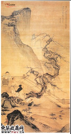 此图写文人雅士在梅下抚琴的情景。老梅虬曲如苍龙盘空,红梅绽开,文人雅士性情激昂,挥斥文章,谈笑风生。人物刻画精细,面部略敷铅粉,衣褶劲利流畅,吸收了北宋李公麟和元代张渥的线描技巧。