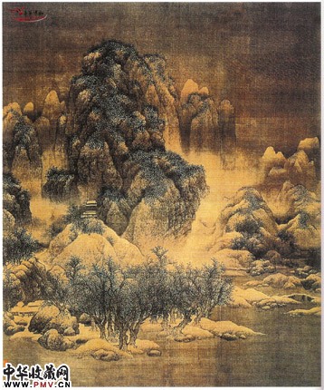 此幅采用全景似构图,画面层次分明,画中群峰屏立,山势高耸,深谷寒柯间,萧寺掩映,古木结林,板桥寒泉,流水从远方萦回而下,真实而生动地表现出秦地山川雪的后的磅礴气势。笔墨浓重润泽,皴擦多于渲染,层次分明而浑然一体,细密的雨点皴余苍劲挺拔的粗笔勾勒,表现出山石和枯木锐枝的质感。