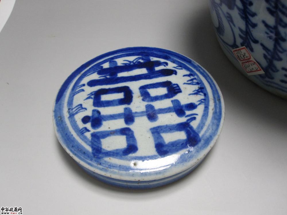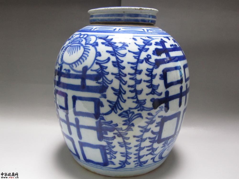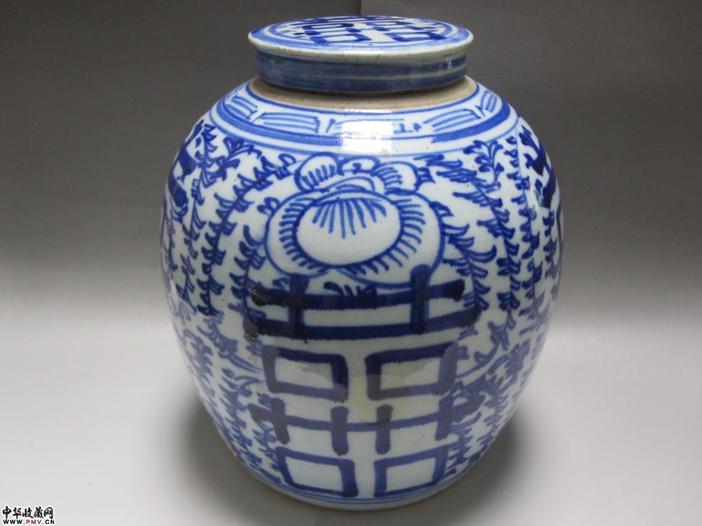 淸中晚期青花缠枝莲四喜特大原盖罐《已售》
