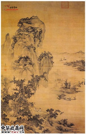 此画描绘了高岭烟霭、远浦水村。左半边作高远景色,山峰巍峨高耸,气势雄奇。隔山坡地翠树葱葱,松柏苍劲,山势和树姿均具在雄伟之姿。板桥、村落,远景是舟帆和水乡,精致开阔,幽美而疏秀。在画法上多学郭熙,那劲峭的山石,奇异的峰头,盘虬的树干,蟹爪的枝杈等等都来自郭熙笔意。画家将北宋郭熙山水的雄奇、繁复、精密等特点与南宋院体山水的简洁、空旷、疏朗等格局有机地结合起来,创造了有别于宋代院体的明代院体画风。
