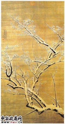 此图绘老梅一枝,笔势遒劲而老辣,古拙而生动。从画中画家自题"大雪围林僵叶木,老梅潇洒正开华"中可以看出,此画是表现雪中傲梅不畏霜雪、不畏严寒的高贵品质。画上有"宣统御览之宝"等收藏印章。