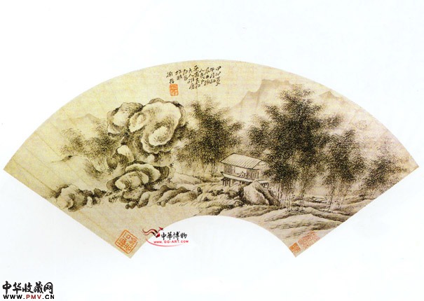 扇面 水墨洒金笺甲申作钤印:石庄、石头和尚题识:甲申夏午月师墨井道人意,为平甫表伯大人雅属即希指正,道存。鉴藏印:曾在黄哲维家、琴轩家藏