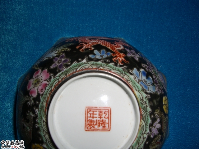 高5.5厘米,口径12.5厘米,底径5厘米;壁厚0.1厘米,重40克。脱胎洋彩。里外腹墨地,主题绘飾海涛五爪龙穿花纹;里外沿下黄地绘玫瑰紫红如意纹;应用红黄蓝白黑紫胭脂红等多色绘制,艳丽生动,寓意吉祥。底飾洁白釉红釉款识-乾隆年制。