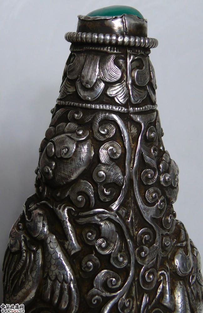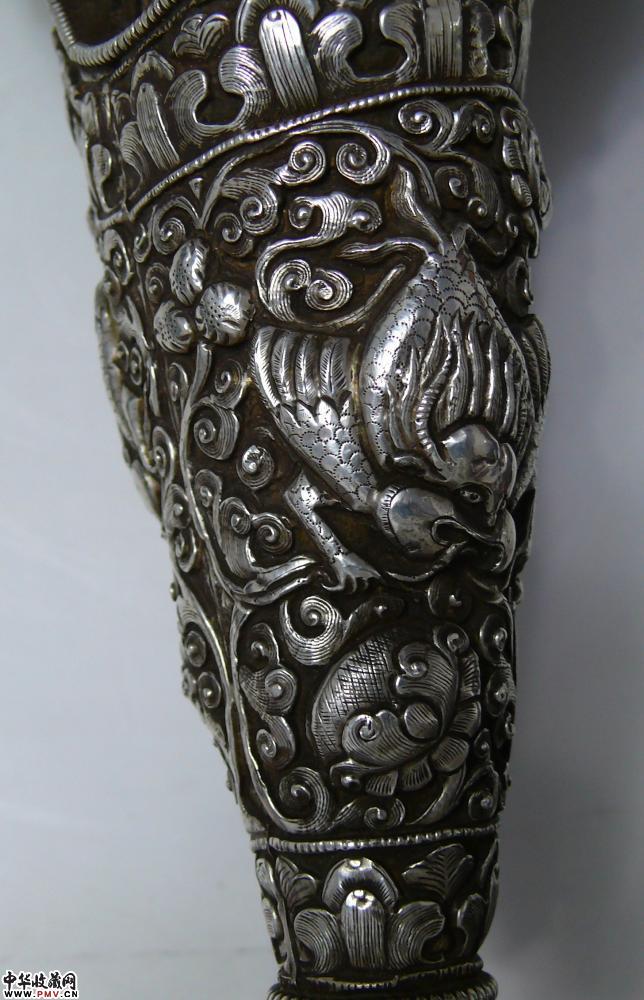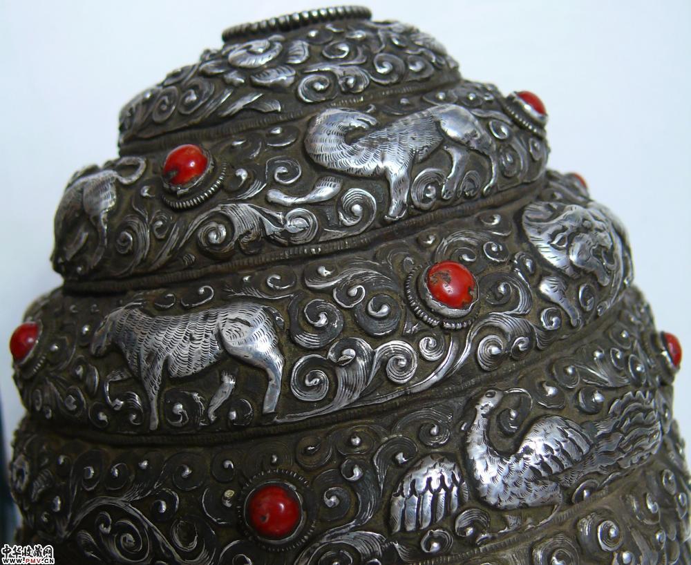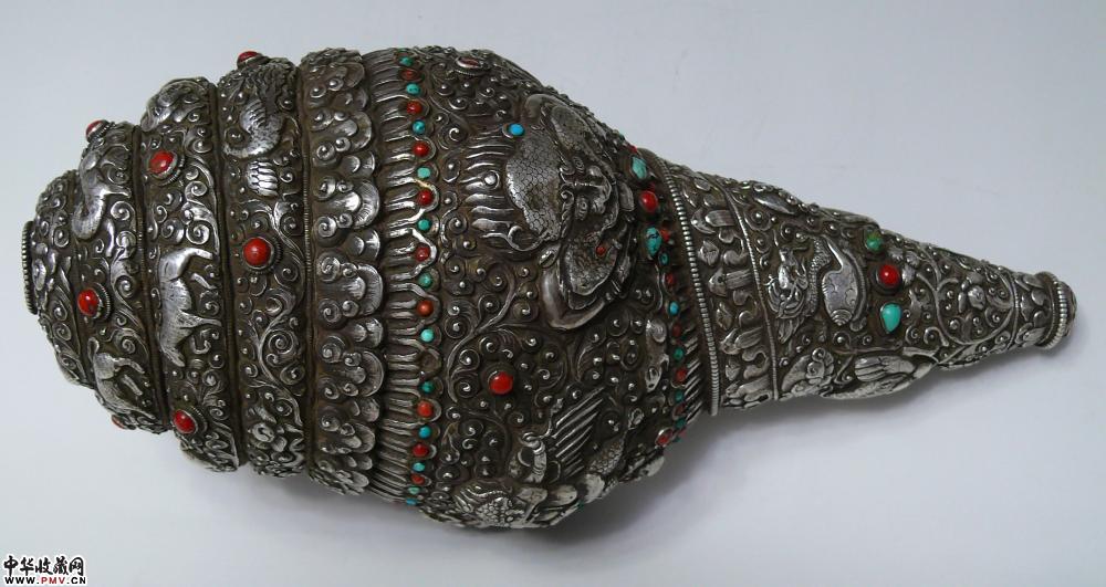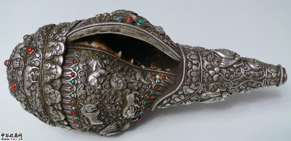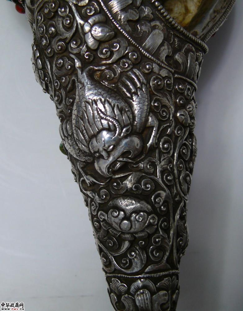 清代全包银满工簪花镶嵌红珊瑚绿松石大法螺