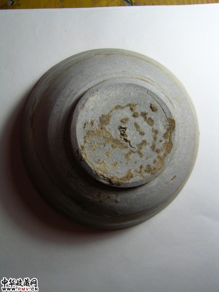 口径15厘米,品相完好,灰白胎,质地细腻,肥润.碗内有三个豆粒斑支钉痕.