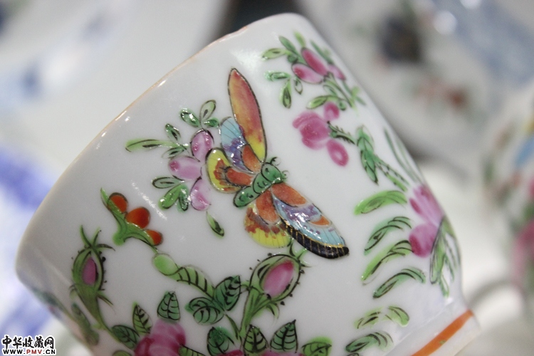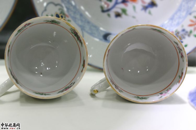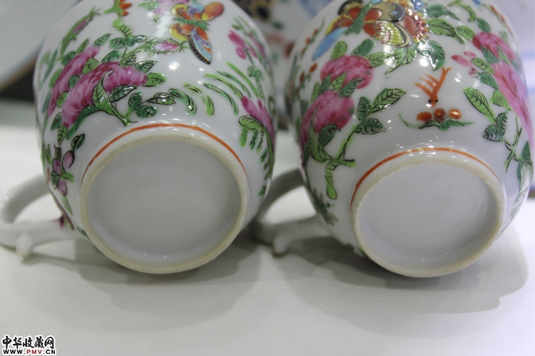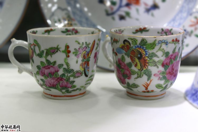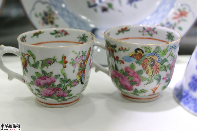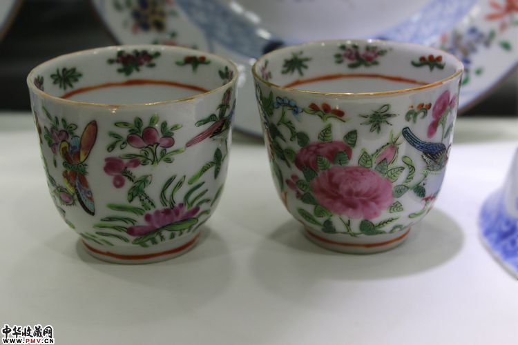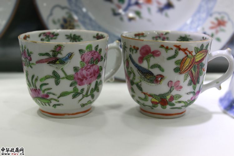 晚清 广彩花鸟彩蝶纹执耳杯一对