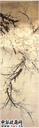图中描绘一株梅树,老干颈峭,断缺处以意笔为之犹如龙爪腾空。一带薄雾淡如轻纱,横亘于画幅中部,烟笼玉树,暗香浮动。