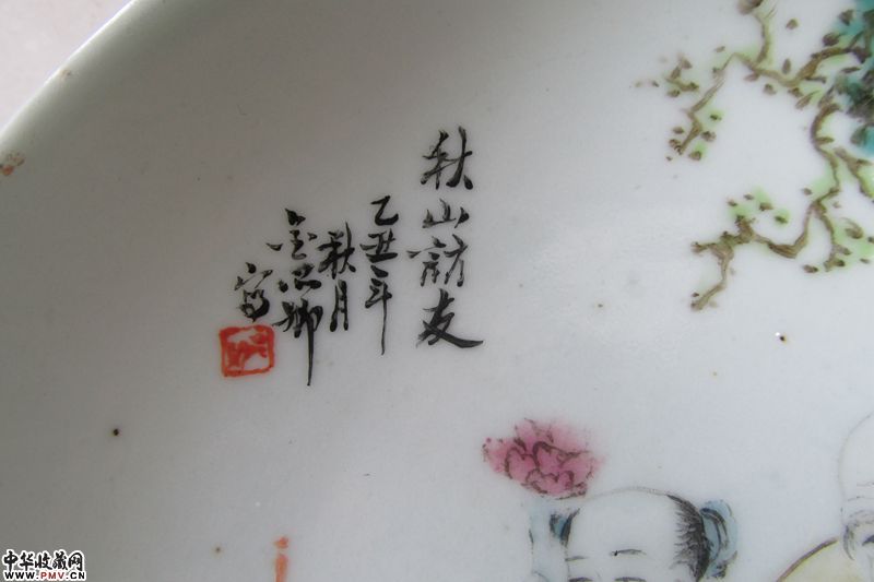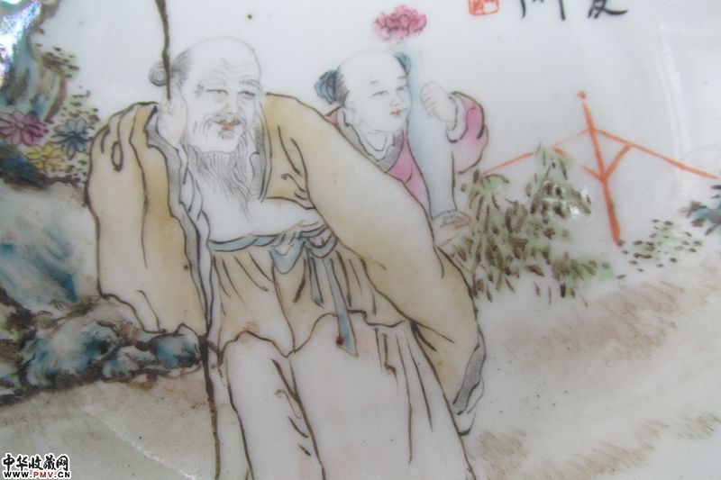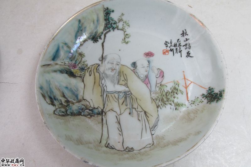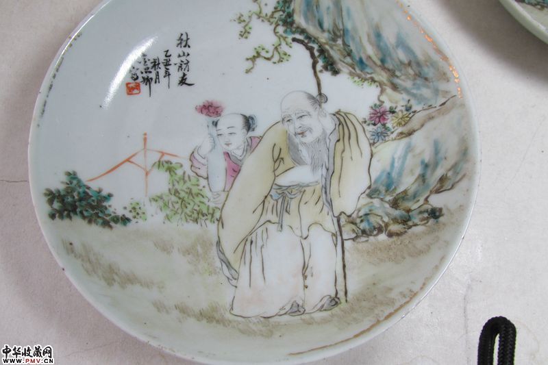 品相:题为“秋山访友”粉彩碟一对,胎釉莹润,绘画人物写实,包浆明显,除一只有老冲一条(见倒数图4),碟子沿口金彩有脱落,其余完好。金品卿,活跃于清同治元年至光绪三十四年间(1862-1908),曾供职景德镇御窑厂。