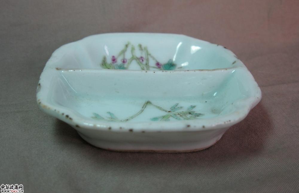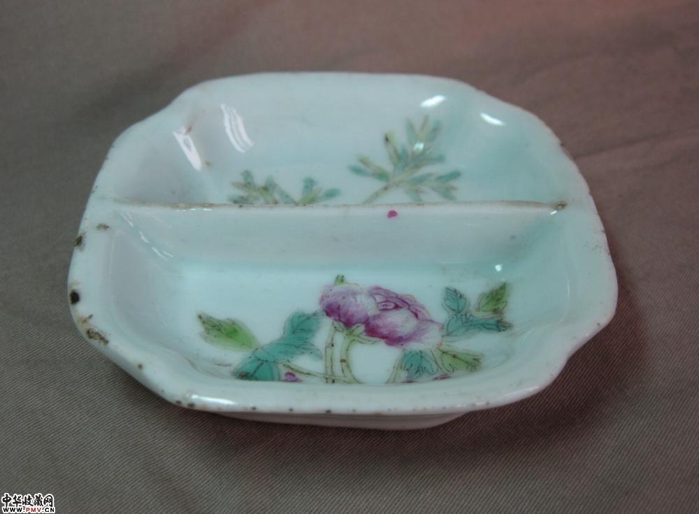 晚清民国粉彩调色盘,釉色莹润,画工精细,胎质细白,边角处极小剥釉,可以说全品相了,口径8公分×8公分.