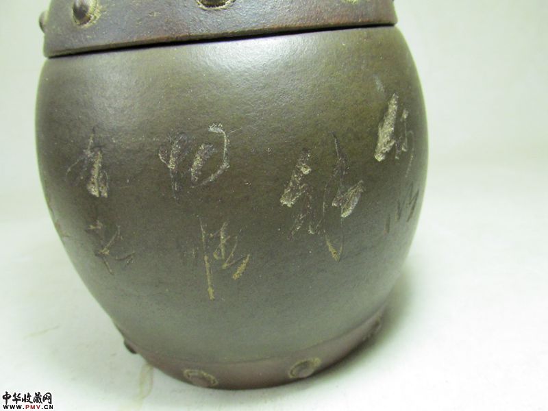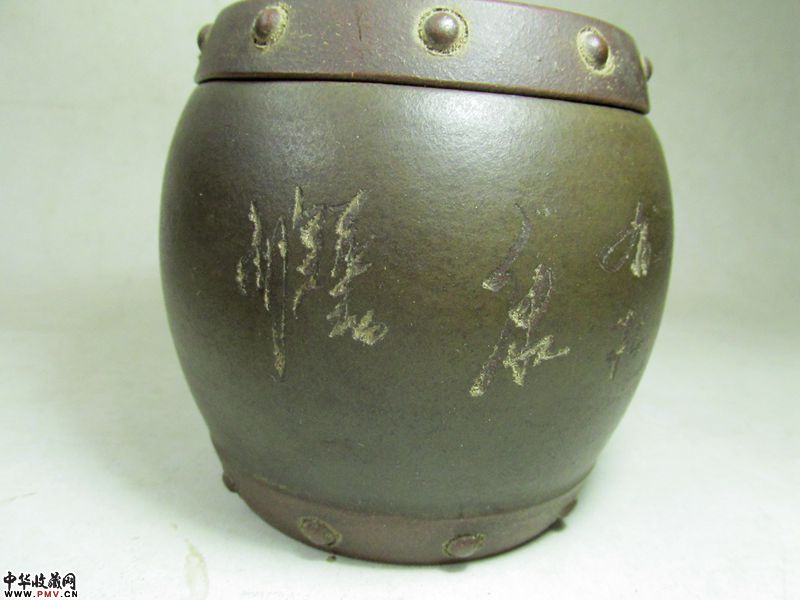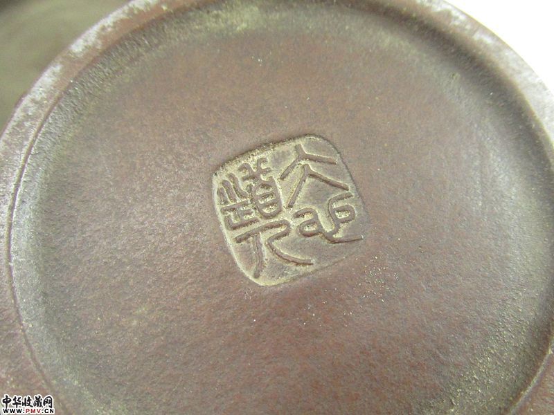 品相:全品相。雕刻诗文兼备,底有“冰心道人”四字方款,是清末民初紫砂大师程寿珍之用印,故此器应是紫砂行内花货名师名人之作品。