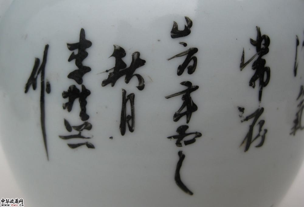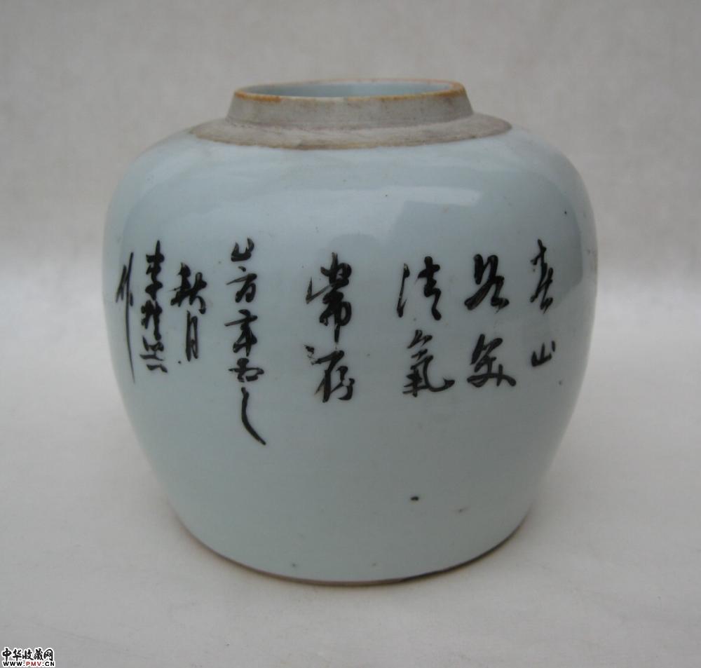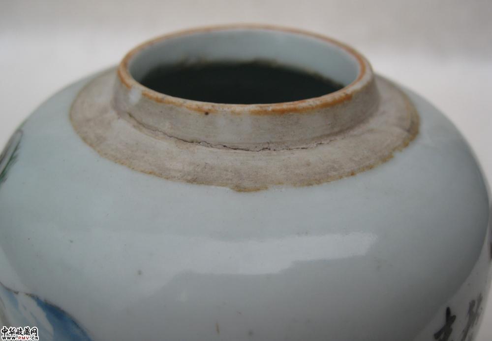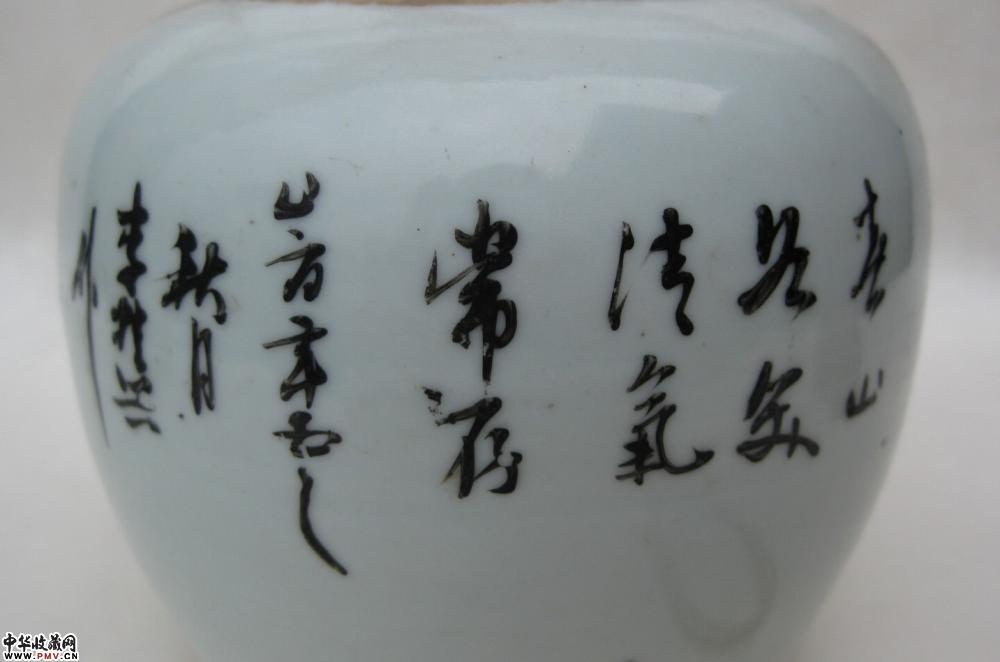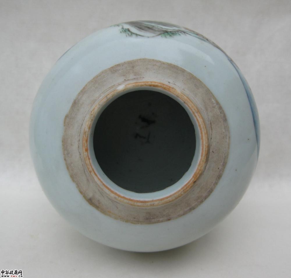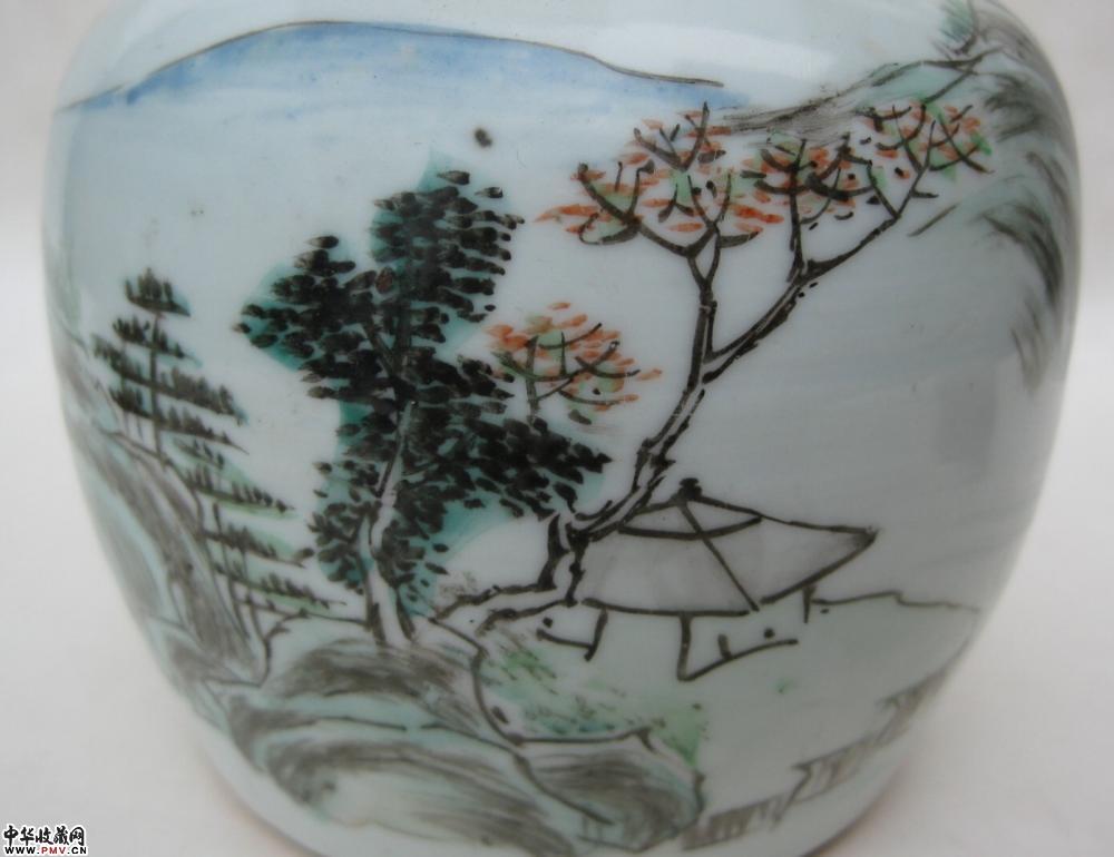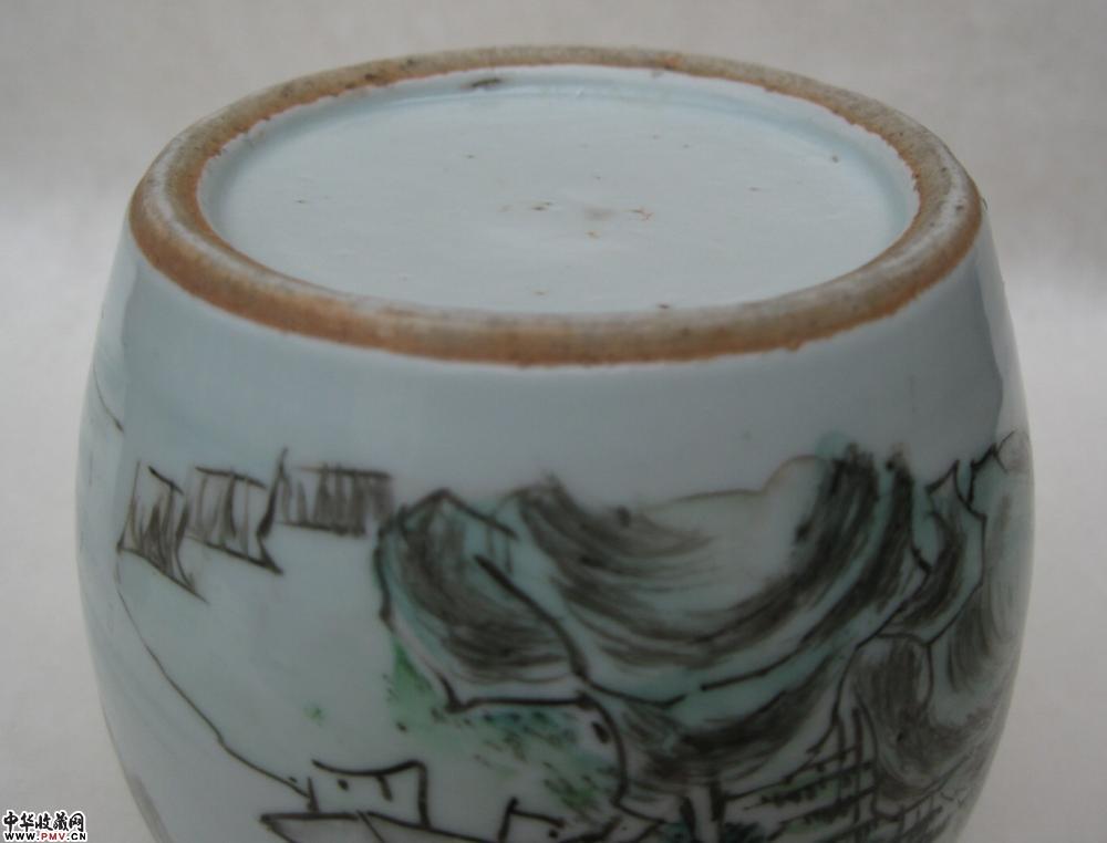 清晚浅绛山水纹罐一只,釉色莹润,胎质细白,画工精细,罐颈转折处见到的是窑纹,不透,可以说全品相了,高9.4公分.