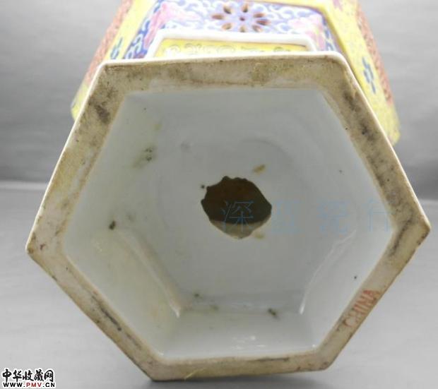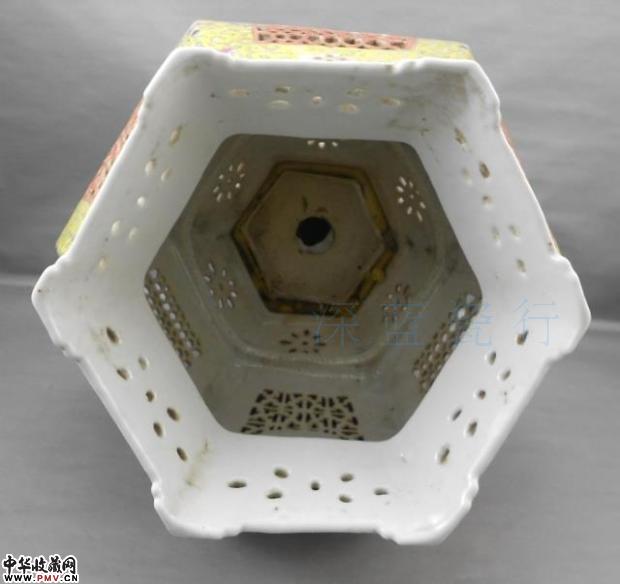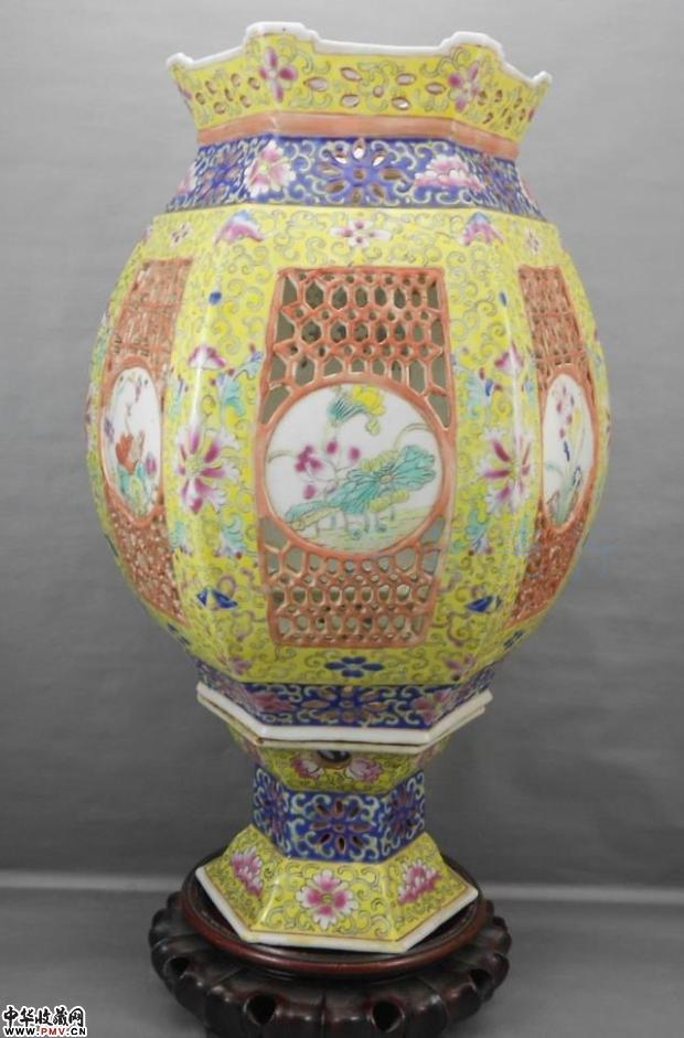 清代黄地粉彩镂空大宫灯,高39cm,宽24cm,全品.(底有洞安装电线使用,底座不可拆卸),如此细路镂空大尺寸的瓷塑灯已经很罕见了,推荐收藏.