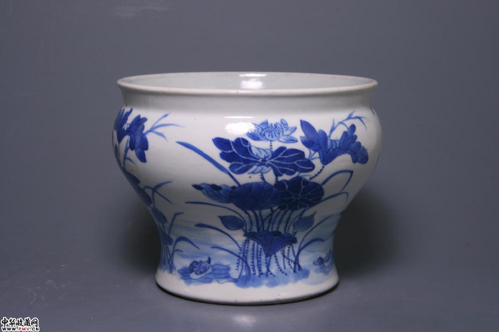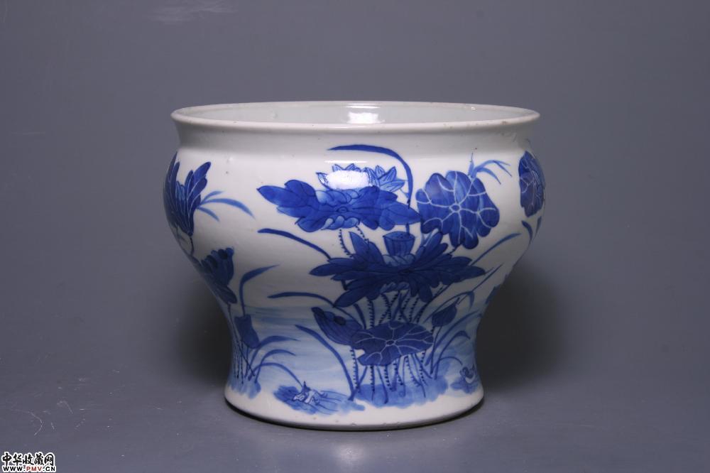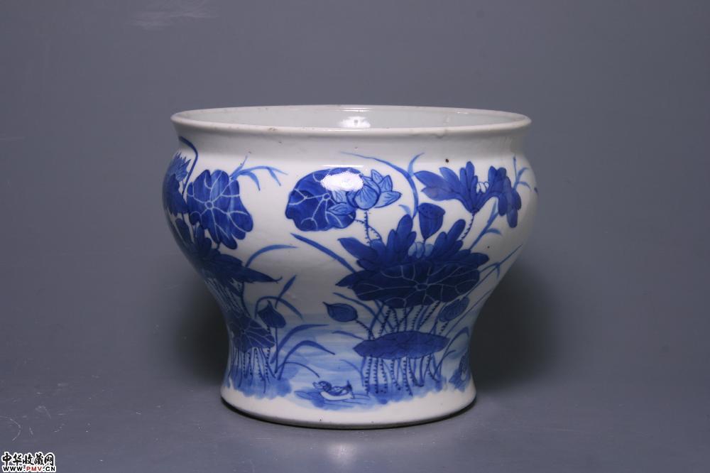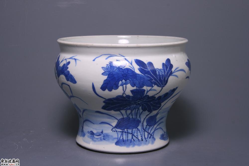 清光绪景德镇窑青花鸭穿莲纹卷缸