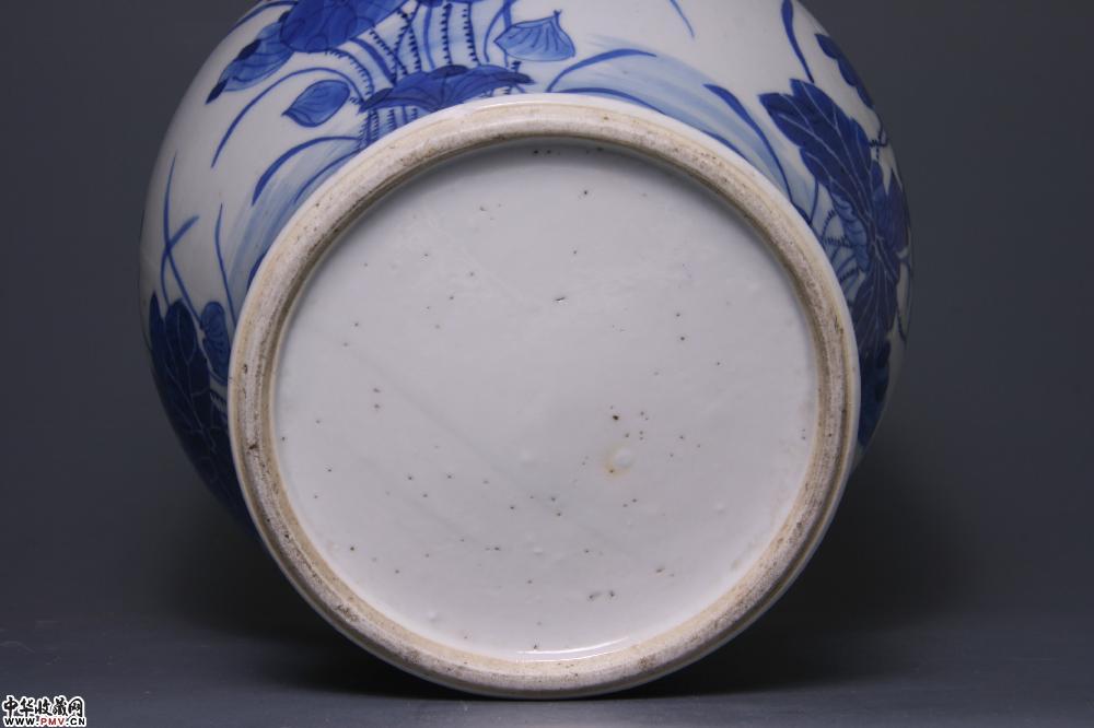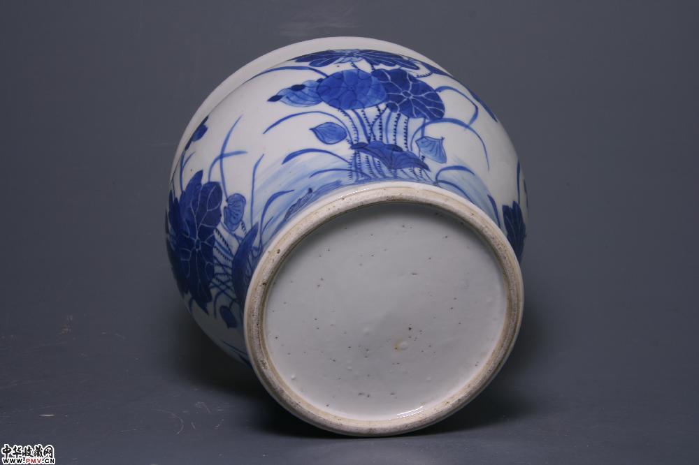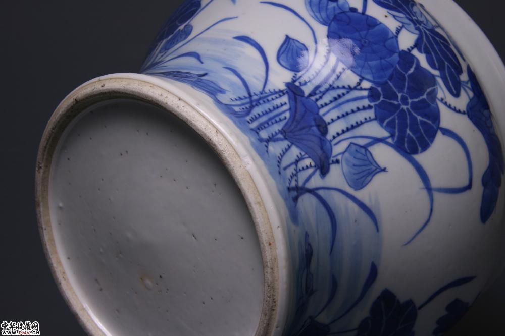 高15.5cm,口径19.3cm,底径13cm,足沿一绿豆大伤釉(懂货者可以忽略不计),其余完好。造型别致,青花呈色直逼康熙,纹饰笔法线条虽然不及康窑劲健老辣,但也颇为轻盈纤巧,荷叶筋脉采用划线留白与浓彩实线勾出两种技法相结合,一阴一阳,使得叶面审美效果更富情趣;莲丛中的水面上四只野鸭各具姿态,或游或潜或鸣,生活气息极为浓厚,好一幅和谐优美的自然景象。不仅可置画卷,而且可怡倦眼。上述种种,可藏之理毕矣。